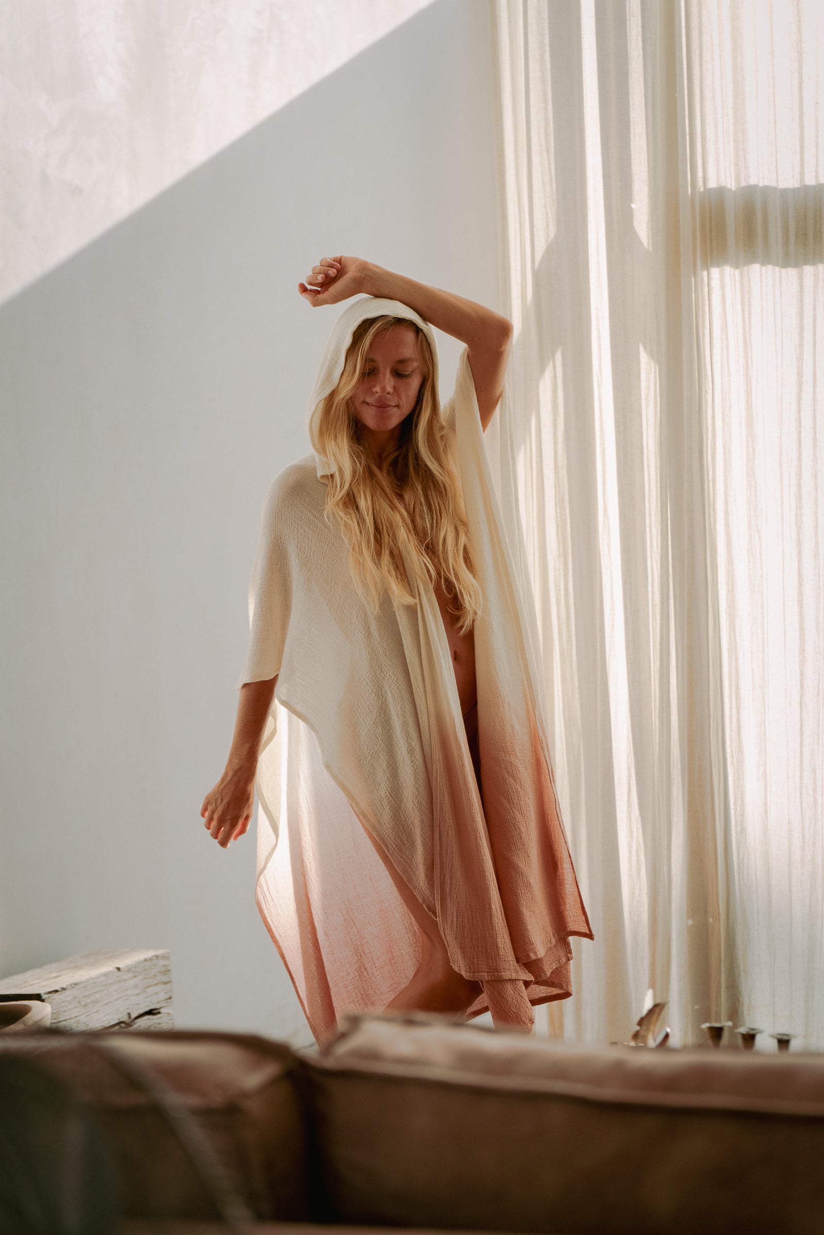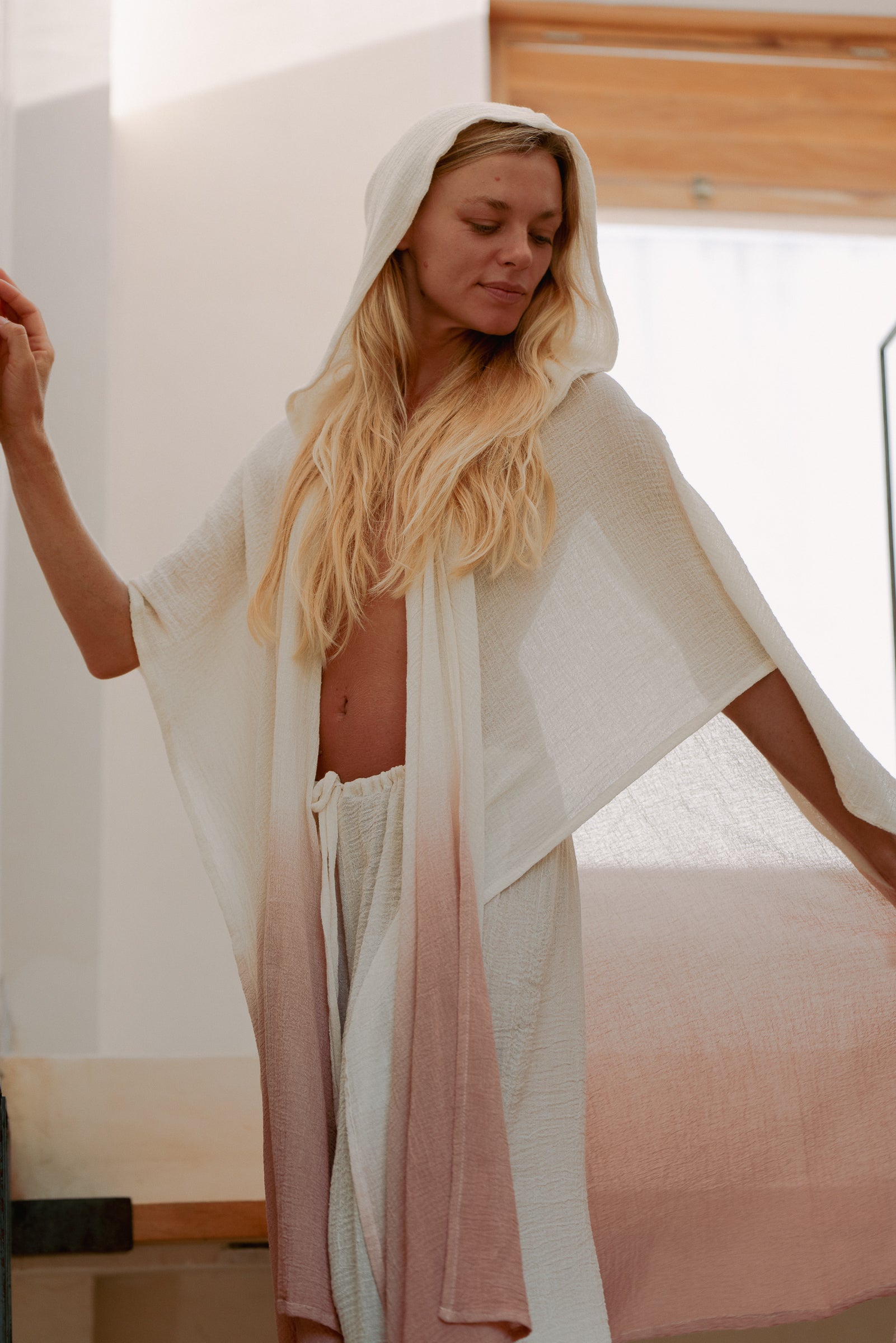 Wrap yourself in whimsy with the Capa Utopia, a hand dyed hooded cape crafted from soft cotton gauze. Light and airy, it adds a splash of playful color to any outfit while keeping you cozy and comfortable. Perfect for those who love to blend style with a touch of artistic charm.