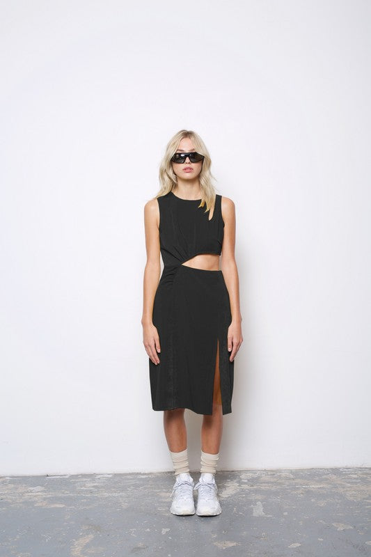 The Katy Dress is your go-to for turning heads with a playful twist. This fitted, knee-length beauty features a sleeveless design and a chic round neck. Eye-catching cut-out details at the waist and left shoulder add a fun, flirty vibe. With a concealed back zip and an off-centre front slit, it hugs your silhouette while letting you move with ease. Perfect for when you want to look effortlessly stunning and feel confident all day or night.